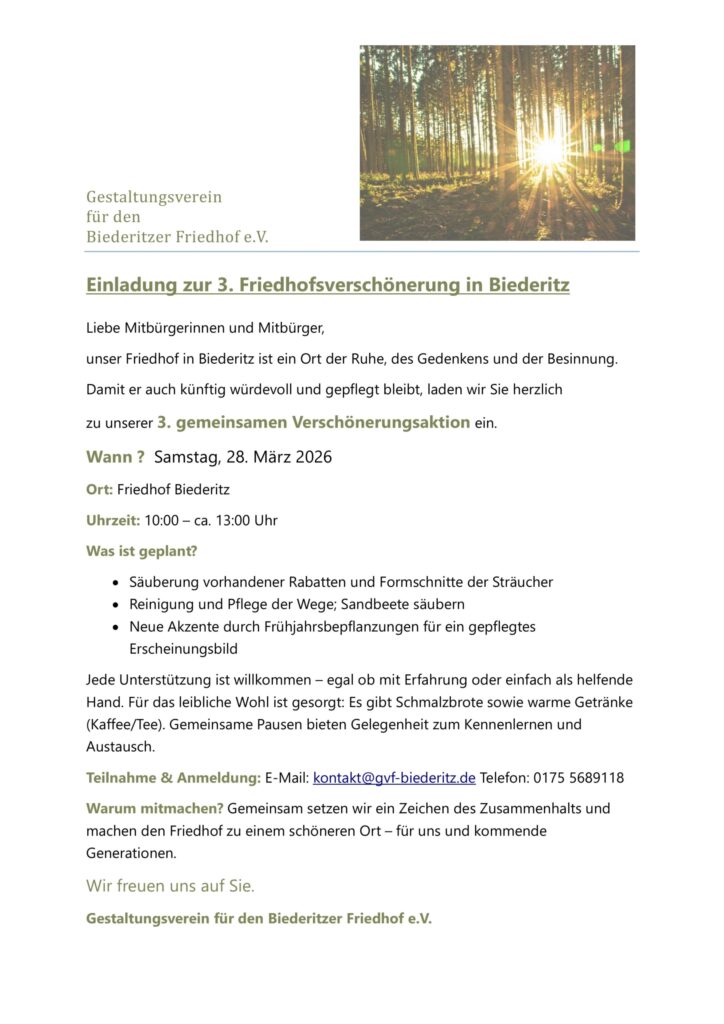 Wir sind der Gestaltungsverein für den Biederitzer Friedhof – eine Gruppe engagierter Menschen aus der Gemeinde Biederitz, die es sich zur Aufgabe gemacht hat, den Friedhof zu einem besonderen Ort des Trostes und der Verbundenheit zu gestalten. Mit viel Eigeninitiative und Herzblut schaffen wir hier nicht nur eine ruhige, heilsame Umgebung für Trauernde, sondern auch einen natürlichen Rückzugsort für Tiere. Unser Ziel ist es, einen Raum zu schaffen, der Menschen und Natur miteinander verbindet und Frieden spendet.